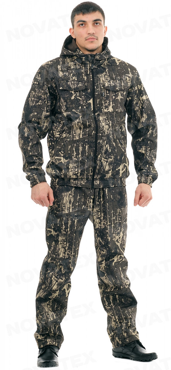 Демисезонный костюм «Барс» (ТМ КВЕСТ) для активного отдыха. Для изготовления этого костюма применяется двусторонняя ткань полофлис: верх плащевая ткань дюспо, изнанка флис. Полофлис обладает хорошей ветрозащитой, практически не впитывает влагу, быстро сохнет, не вызывает аллергии. Низ укороченной куртки собран на широкую простроченную резинку, обеспечивая комфортное прилегание по бедрам. Капюшон регулируется по овалу лица. Застежка-молния защищена внутренней ветрозащитной планкой. Манжеты рукавов снабжены широкой резинкой, которая не передавливает и не натирает кожу, и в тоже время достаточно плотная, чтобы не пропускать ветер. На куртке два верхних накладных кармана с клапанами на кнопках и два нижних прорезных с листочками без застежки. Брюки по низу регулируются утяжками. Пояс брюк на широкой простроченной резинке, дополнен шлевками. Два кармана у пояса без застежки. Рекомендуется для всех любителей активного отдыха, туристов, а также охотников и рыбаков.