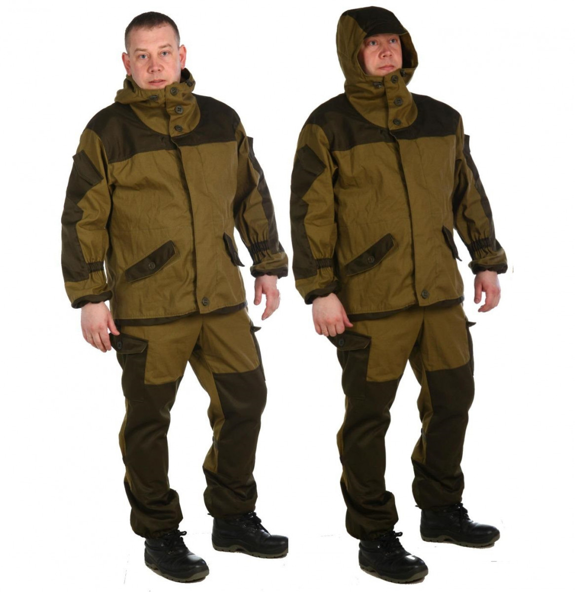 Костюм выполнен из 100% хлопковой ткани. Сложный анатомический крой делает его незаменимым для любителей активного отдыха. Куртка на пуговицах, с двухслойной супатной застежкой. Плечи усилены плотной непромокаемой тканью. Брюки с поясной резинкой и шлевками под ремень. Колени с усилением и дополнительным объемом.