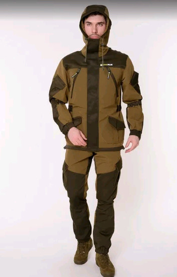 Костюм выполнен из смесовой ткани. Сложный анатомический крой делает его незаменимым для любителей активного отдыха. Куртка на пуговицах, с двухслойной супатной застежкой. Плечи усилены плотной непромокаемой тканью. Брюки с поясной резинкой и шлевками под ремень. Колени с усилением и дополнительным объемом.