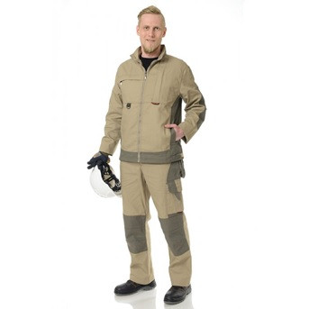 костюм состоит из куртки и брюк. Дополнительно комплектуется футболкой (100% хлопок). Куртка прямого силуэта c удлиненной спинкой. Полочка и спинка с фигурными кокетками и рельефам. Полочка с верхними карманами на молнии, с боковыми карманами. Ширина по низу куртки и рукава регулируется патами с контактной лентой. Рукава двухшовные, с анатомическими накладками. Воротник стойка. Бортовая застежка центральная на молнию. Низ куртки с притачным фигурным поясом. Брюки прямого силуэта с застежкой в среднем шве на молнию, притачной пояс со шлевками. Съемный пояс с пряжкой, съемные навесные трехслойные карманы-портфели.Передние половинки оформлены контрастными наклонными карманами и анатомическими наколенниками. Задние половинки брюк с кокетками, с накладными карманами и клапаном. В области боковых швов накладные карманы для инструментов с дополнительными карманами. Низ брюк усилен вторым слоем отделочной ткани.