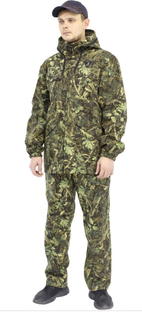 Костюм состоит из куртки с четырьмя карманами в одном из которых находится антимоскитная сетка. Манжет рукава-резинка. Капюшон не отстегивается. Брюки с двумя карманами. Пояс на резинке. Ткань смесовая.