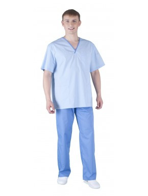 Комплект мужской медицинский свободного силуэта. С V-образным вырезом горловины. На полочке кокетка и три накладных кармана: один нагрудный и два нижних. Над нагрудным карманом шлевка под бейджик. На спинке кокетка и два защипа для свободы облегания.