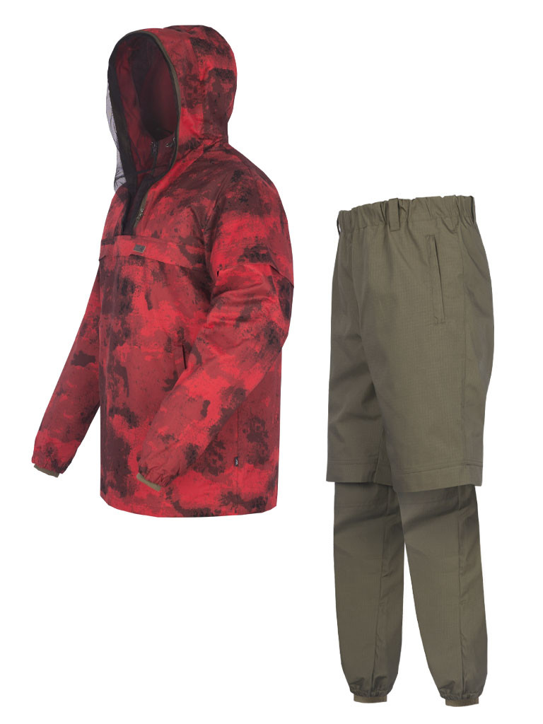 Костюм мужской рекомендован для охоты, рыбалки и активного времяпрепровождения в летний период за городом. Эргономичный покрой обеспечивает удобную посадку по фигуре. В изготовлении используется смесовая ткань, которая сочетает в себе лучшие характеристики натуральных и синтетических волокон. Комплект состоит из куртки типа «Анорак» и прямых брюк. Куртка • центральная застежка на "молнию" до кокетки; • капюшон притачной регулируется по высоте патой с полукольцами, по лицевому вырезу эластичным шнуром и стопором, для более плотного прилегания; • москитная сетка пристегивается к капюшону на "молнию", дополнительно защищает от насекомых; • карман в шве кокетки для москитной сетки; • два наклонных прорезных кармана с листочками и "молнией", легкодоступны и удобны для хранения мелочей; • складки-ловушки на груди, рукавах, спинке защищают от проникновения клещей; • рукав втачной, низ имеет утяжку эластичной резинкой, для более плотного прилегания; • внутри в нижней части рукава и