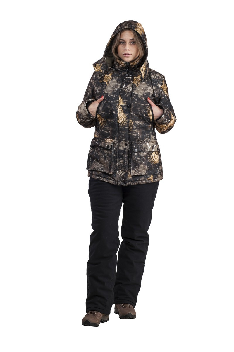 Универсальный утеплённый комфортный костюм для зимней рыбалки, охоты и активного отдыха.Выполнен из ветронепродуваемой и водонепроницаемой мембранной ткани. Верхний слой ткани с ПИЧ эффектом — это мягкая бархатистая поверхность. Костюм в модном в этом сезоне Animal принт. Ткань удобна и проста в уходе. Предназначен для защиты от пониженных температур, ветра, атмосферных осадков в зимний период. Состоит из куртки и полукомбинезона с эластичными регулируемыми лямками. Куртка с ветрозащитной планкой.Капюшон анатомического кроя, отстёгивающийся, регулируется по краю обзора. Утеплённый полукомбинезон с завышенной талией. По объёму регулируется поясом с фиксаторами, стягивающими талию, которые в свою очередь по спинке скрыты в кулисе. Отлично сидит на фигуре. Для удобства переобувания по низу штанин — расширитель на молнии с планкой.