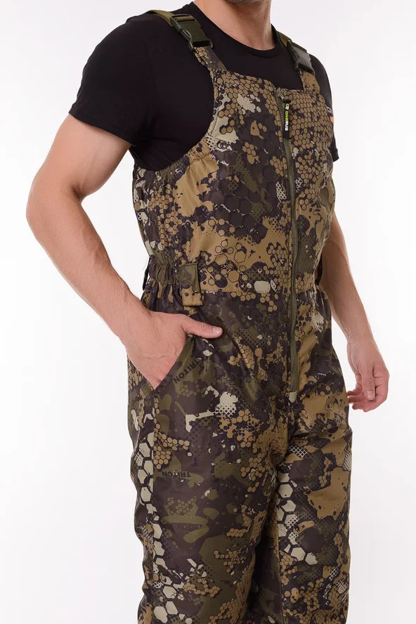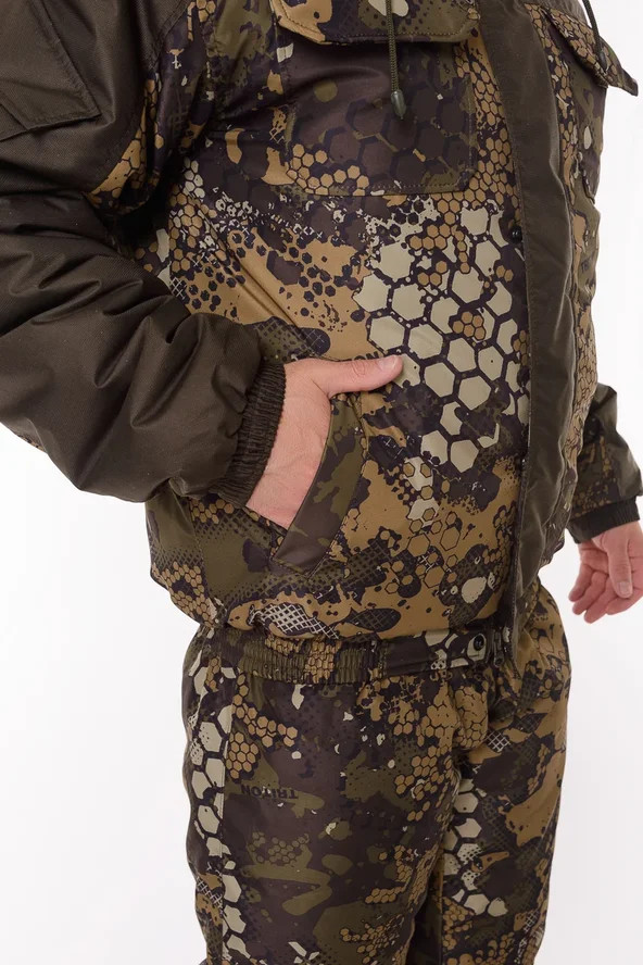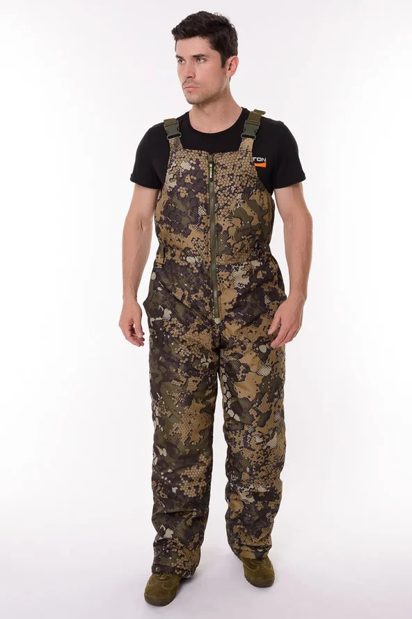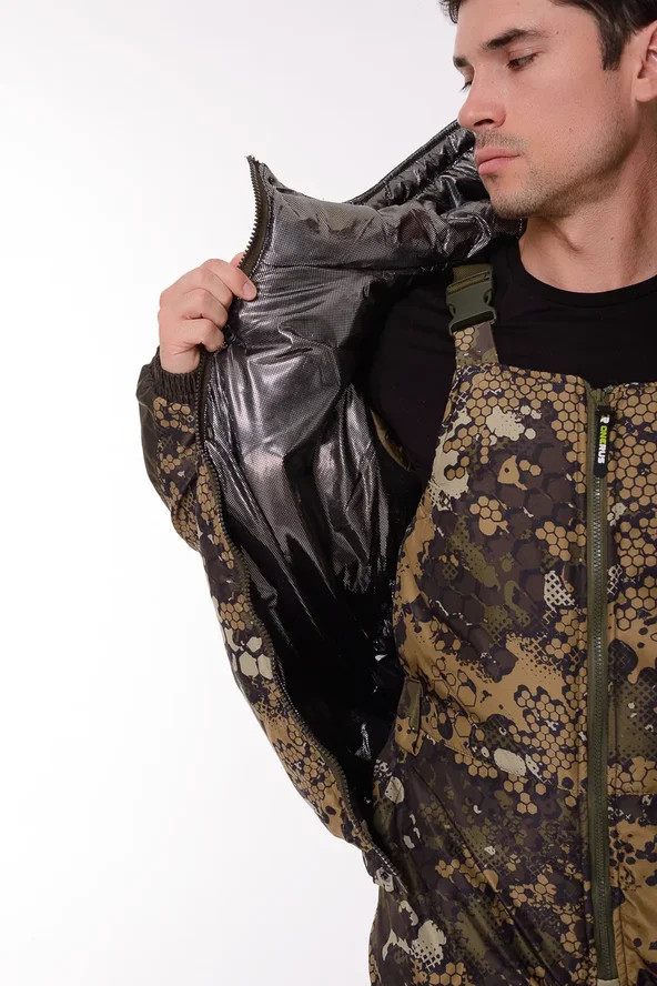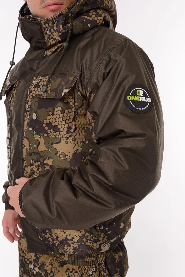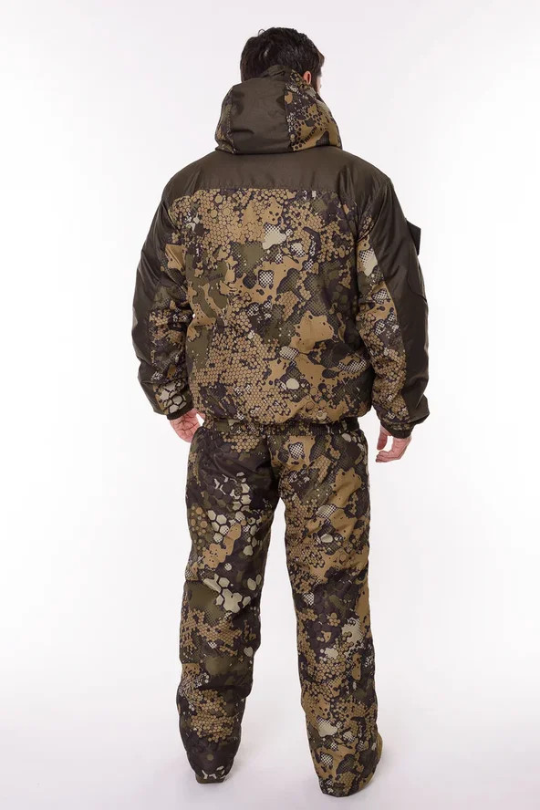 Основная ткань Дюспа Утеплитель Синтепон 350 г/м² Подклад фольгированный Мембрана 3000/3000 Съемный капюшон Капюшон и воротник отделаны флисом Трикотажные манжеты на рукавах + утяжка липа Молнии расширители по низу брюк + планка на липе Утяжка по низу куртки Лямки подтяжки типа горка, с перекрестием в области лопаток