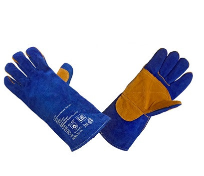 Выполнены из высококачественного синего спилка на подкладке из хлопковой ткани и флиса, длина 350 мм. На ладони и большом пальце дополнительное усиление из желтого спилка, что увеличивает износоустойчивость и защитные свойства при механических работах и увеличивает защиту от повышенных температур, брызг и расплавленного металла. Наличие мягкой флисовой подкладки повышает комфорт использования и позволяет использовать краги в зимнее время. Швы прошиты нитью. Кевлар и усилены вставками из кожи.