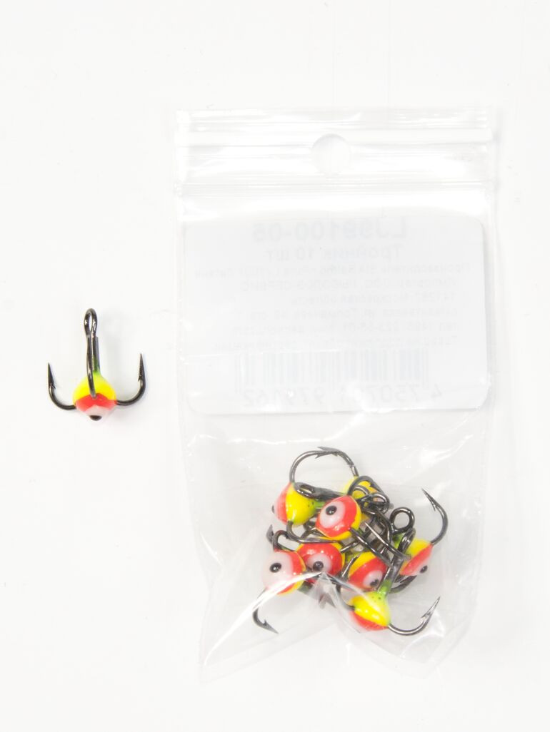 Тройники с пластиковой цветной каплей. Используется для комплектации балансиров и вертикальных блёсен.