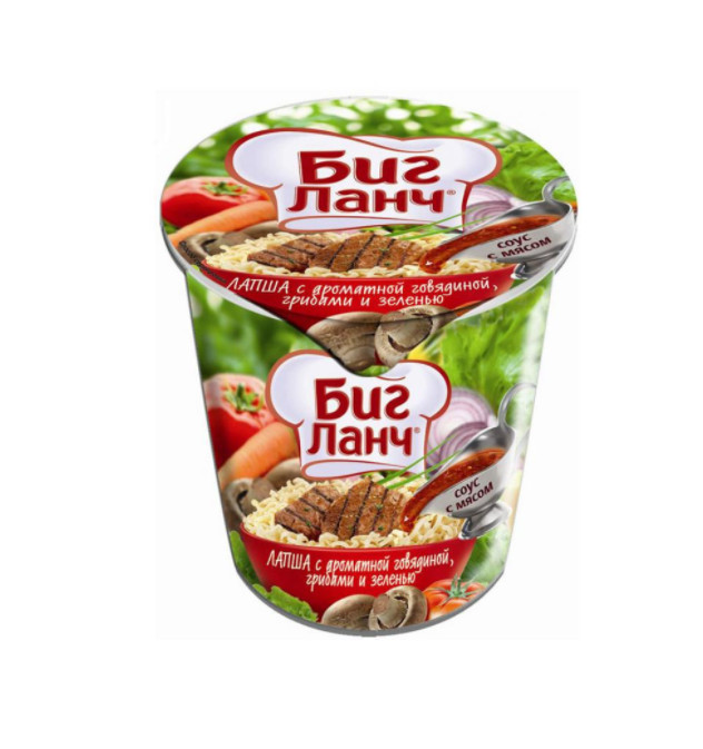 Лапша «Биг Ланч» с ароматной говядиной грибами и зеленью - вкусное, а главное быстрое в приготовлении блюдо. Достаточно лишь залить кипятком на 5-10 минут, и Вы получите аппетитный сытный обед. Также лапшу можно использовать в качестве дополнения к основу блюду, либо же наоборот - дополнить ее другими продуктами, например половинку яйца или же кусочек мяса, дабы сделать трапезу еще вкуснее и сытнее!