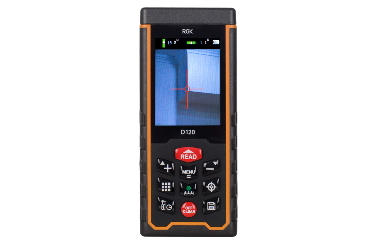 Лазерная рулетка RGK D120 предназначена для измерения расстояния в диапазоне от 0.3 до 120 метров в помещениях и на открытом пространстве. Она поддерживает следующие функции: вычисление площади и объема, расчет недосягаемых расстояний по теореме Пифагора, сложение и вычитание измерений, измерение заданного расстояния, измерение с задержкой, режим непрерывных измерений. Данная модель имеет возможность подключаться к ПК для анализа и передачи данных. При помощи встроенного цифрового уровня можно производить измерения в горизонт. Угол наклона - ±90°.