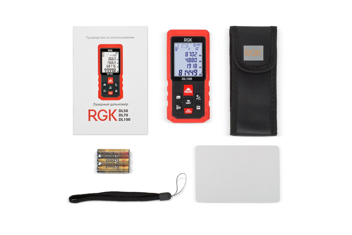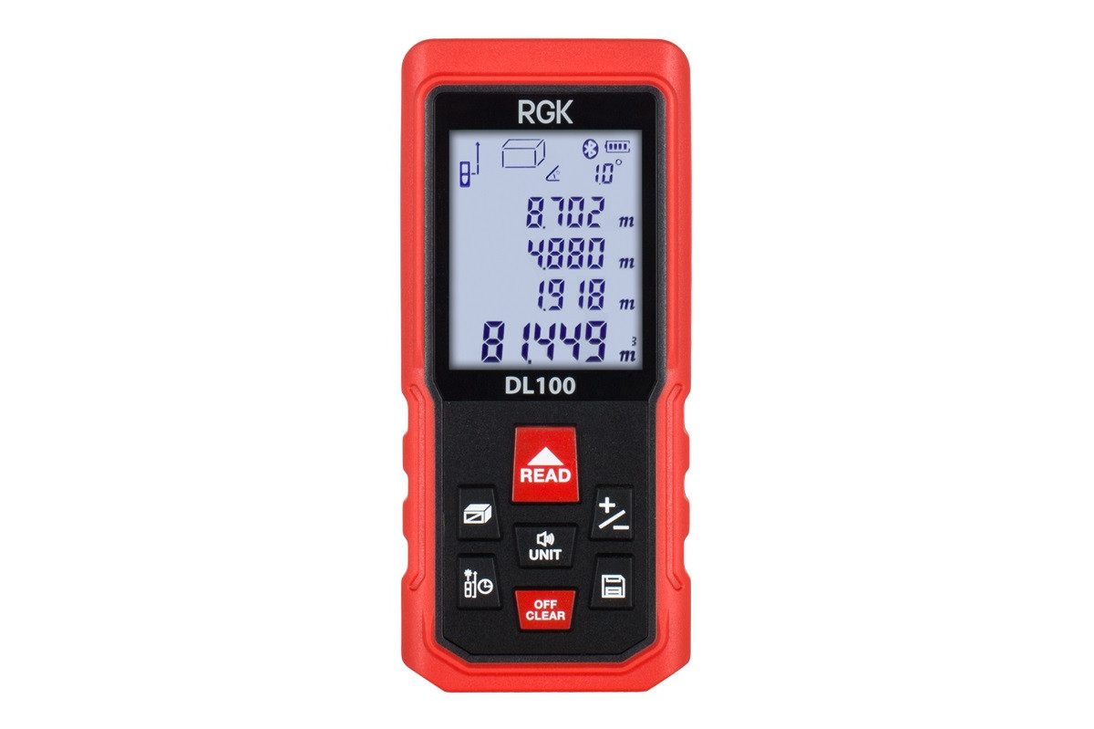 Лазерный дальномер с угломером RGK DL100 с опцией «помощник маляра», которая поможет быстро вычислить сумму площадей стен помещения для расчета необходимого объема материала.