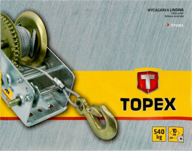 Канатная лебедка с храповым тормозом (0.55 т, канат 10 м) TOPEX 97X085 оснащается крюком, который крепится к канату через специальную петлю. Храповый механизм значительно упрощает подъем грузов. Использование лебедки допускается в домашних условиях при перемещении объектов весом до 550 килограммов