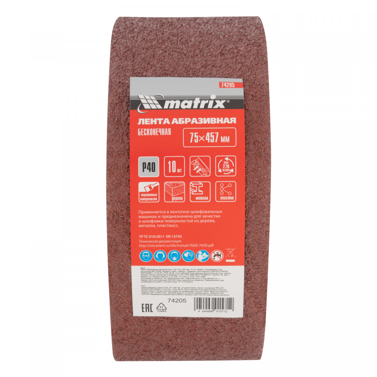 Бесконечная абразивная лента Matrix 74205 с зернистостью P 40, 10 шт. в упаковке, устанавливается на ленточную шлифовальную машину, совместимую со сменными элементами размером 75 х 457 мм. Применяется для черновой обработки деревянных и металлических поверхностей, снятия лака, краски, ржавчины, заусенцев и т. д.