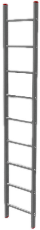 Лестница односекционная Новая высота серия NV100 1х9 предназначена для профессионального и полупрофессионального применения. Стальные кронштейны, скобы и зацепы обеспечивают плотный зажим выносной секции. Направляющие и ступени изготовлены из легированного рифленого алюминиевого профиля и имеют дополнительные рёбра жесткости.