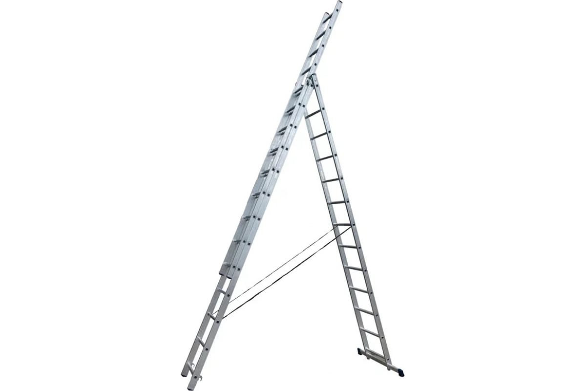 Универсальная трехсекционная лестница используется при выполнении различных работ на большой высоте.На ступенях предусмотрено рифление, оно предотвращает проскальзывание стопы при подъеме и спуске.Модель изготовлена из алюминия, благодаря чему отличается устойчивостью к коррозийным процессам и прочностью.Капроновые страховочные ремни предотвращают раздвижение лестницы во время работы.