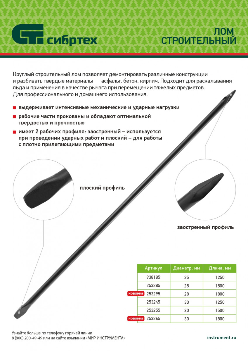 Круглый строительный лом Сибртех 253295 длиной 1800 мм и диаметром 28 мм позволяет демонтировать различные конструкции и разбивать твердые материалы — асфальт, бетон, кирпич. Подходит для раскалывания льда, может применяться в качестве рычага при перемещении тяжелых предметов. Лом предназначен для профессионального использования, а также будет полезен в домашнем хозяйстве.