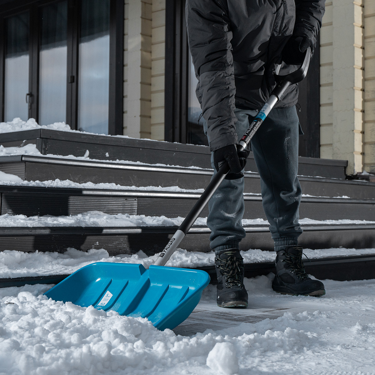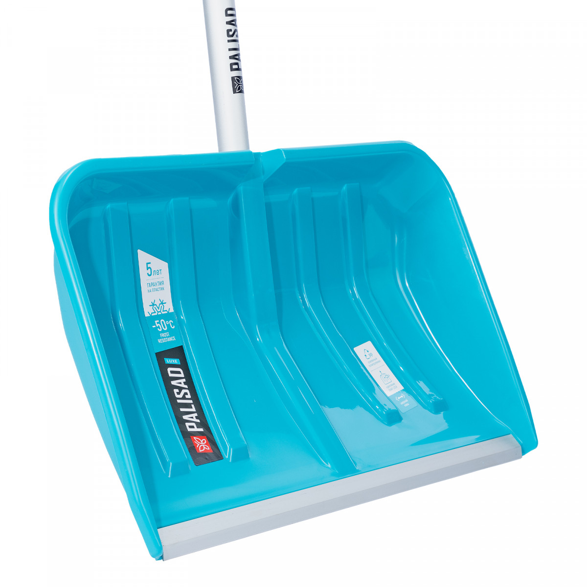 Лопата-скрепер Palisad LUXE 61727 размером 550 x 340 x 1450 мм, с ковшом из полипропилена и алюминиевым черенком с ПВХ-накладкой, предназначена для уборки снега. Широкий ковш с бортиками вмещает большое количество снега. Лопата позволяет расчистить садовую дорожку, тротуар, площадку перед гаражом и т.д.