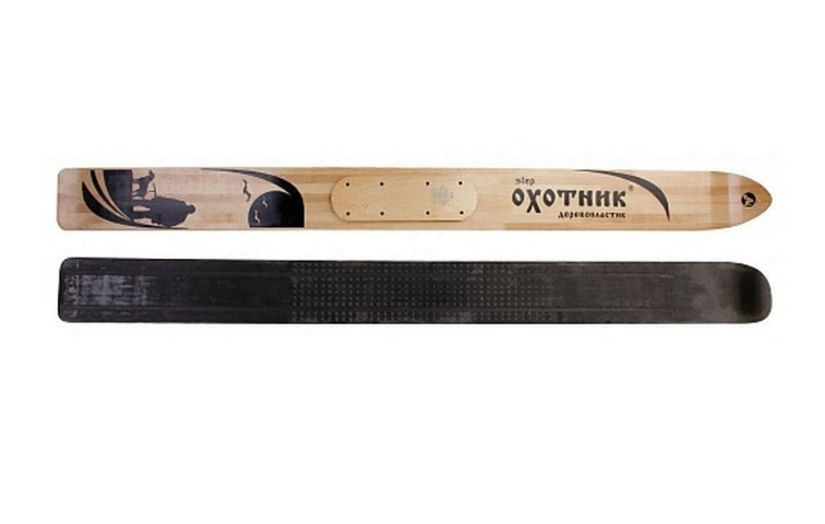Лыжи «Охотник» применяются практически на всей территории России, кроме некоторых южных регионов. Они изготовлены из древесины лиственных пород (береза, осина). Склейка лыж «Охотник» произведена морозо- и влагоустойчивым клеем шведского производства, что придает лыжам особую прочность. Покрытие лицевой стороны данных охотничьих лыж выполнено финским морозоустойчивым лаком с повышенным глянцем. В пластиковых охотничьих лыжах на скользящей поверхности применяется полиэтилен низкого давления, что предотвращает быстрое истирание нижней части лыжи. Это преимущество позволяет использовать их по насту. Также в теплую погоду снег не налипает на пластик, что предопределяет использование данного вида лыж в температурном интервале от +5 С до -10 С. При более низких температурах дерево-пластиковые охотничьи лыжи малоэффективны. Для наилучшего скольжения, перед применением, пластиковые лыжи необходимо проциклевать и смазать парафином. Ширина 150 мм.
