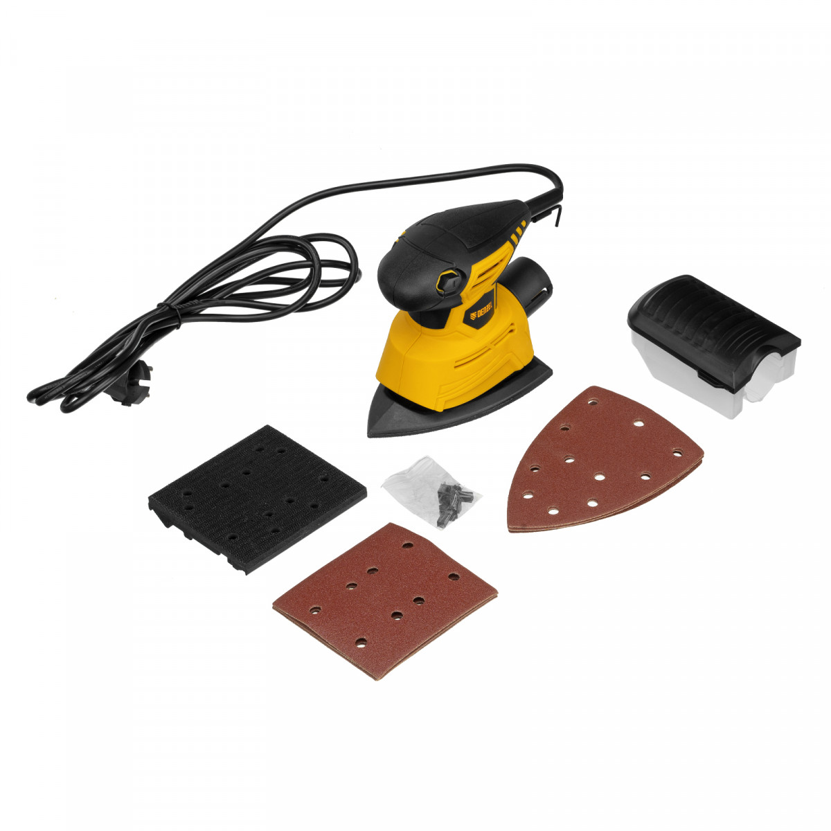 - Готовность к работе — в комплект входит 2 набора шлифовальной бумаги для прямоугольной и треугольной подошв, а также запасные угольные щётки.