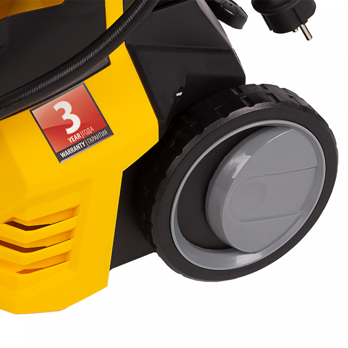 - Удобная транспортировка — мойка оснащена колесами, а на корпусе предусмотрена ручка.