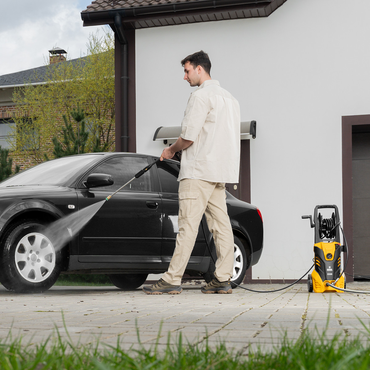 - Мобильность — длина шланга и сетевого кабеля составляет 5 м, что позволяет свободно перемещаться по рабочей зоне.