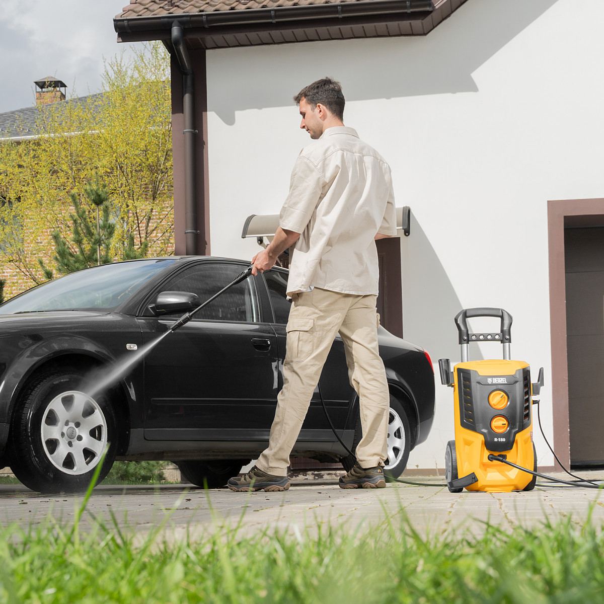 Колесная моечная машина высокого давления Denzel R-180 58238 мощностью 2200 Вт и производительностью 380 л/ч подает струю воды под давлением 180 бар и служит для очищения поверхностей. Позволяет быстро привести в порядок садовые дорожки, удалить пыль и грязь с фасада здания, автомобиля, велосипеда или мотоцикла, отмыть садовый инвентарь. Моечная машина подключается к водопроводу, а при его отсутствии может забирать воду из любого резервуара, работая в режиме самовсасывания. Устройство пригодится для поддержания порядка на загородном участке.