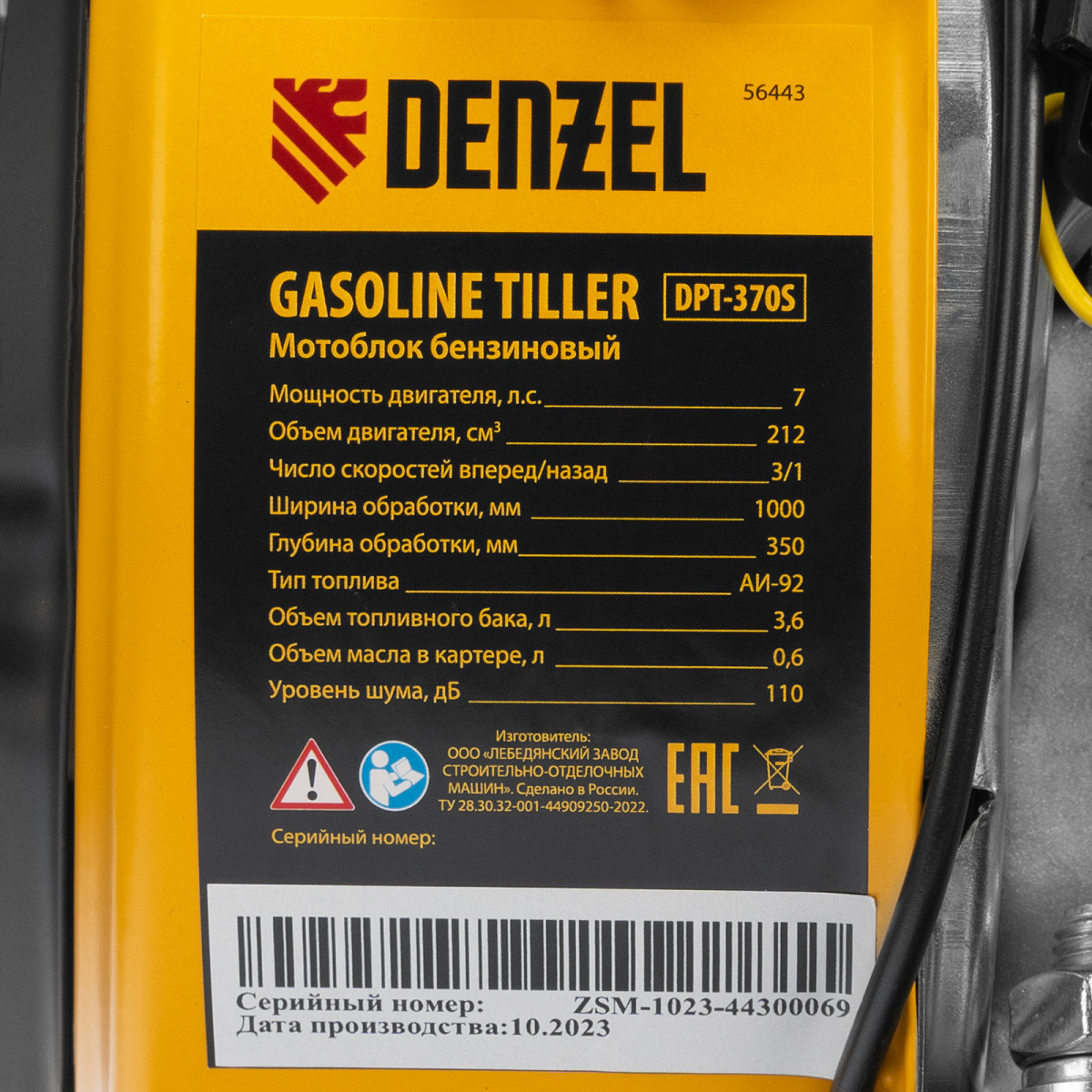 Мотоблок Denzel DPT-370S 56443 мощностью 7 л. с., с 24 фрезами (3 х 4 с каждой стороны), шкивом отбора мощности (ШОМ), количеством передач 3 вперед/1 назад, предназначен для рыхления, боронования, выравнивания почвы, прополки и выполнения других сельскохозяйственных работ на огородных и садовых участках при температуре от -15 до +40 ℃. Максимальная ширина обработки достигает 1000 мм, максимальная глубина — 350 мм.