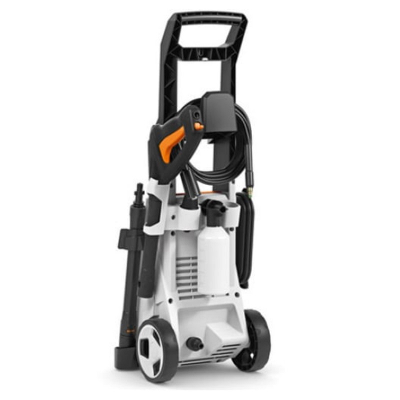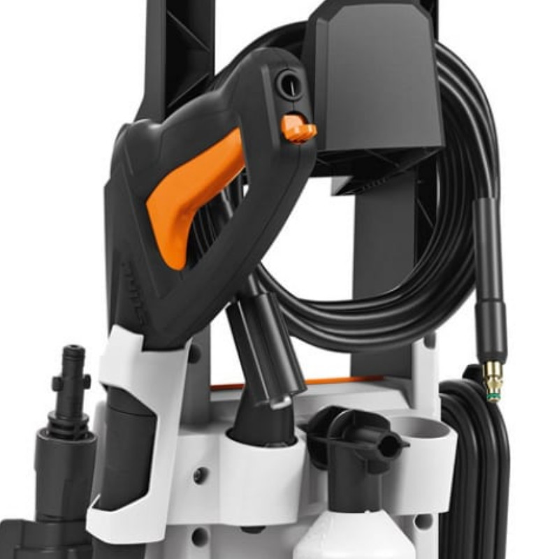 Мойка высокого давления STIHL RE 90 – удобное приспособление для очищения поверхностей от пыли, грязи, плесени и мха. Имеет двигатель на 1800 Ватт, работает при давлении 100 бар. Мойка имеет помпу из нержавеющей стали. Оборудована шлангом из прочного материала, устойчивого к работе под высоким давлением. Расход воды этой модели – 516 литров в час. В комплекте к мойке STIHL RE 90 идут две насадки – роторная и плоскоструйная. Первая форсунка создает мощную точечную струю, которая позволяет использовать мойку для очистки разных поверхностей от сложных и стойких загрязнений. Она способна вращаться на 360⁰, поэтому поможет очистить труднодоступные места. Плоскоструйная форсунка бережно очищает большие объекты и эмалированные, окрашенные поверхности. Имеется возможность регулировки силы струи. Специальная насадка для пены увеличивает эффективность очищения. Емкость для моющего средства расположена в специальном отсеке рядом с помпой, а кнопка подачи пены – на пистолете. Мойка также оснащена транспортировочными колесами для комфортного перемещения по рабочей площади. При транспортировке агрегата пистолет можно установить в боковой фиксатор. Купить мойку STIHL RE 90 можно для очистки плиточных и каменных дорожек, автомобильного покрытия, заборов, стен домов, гаражей, дачных беседок и садовой мебели.