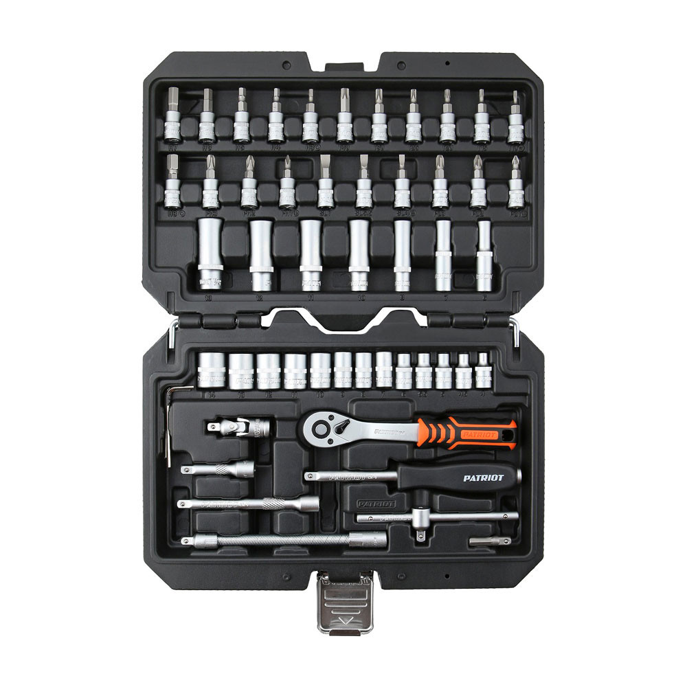 Набор включает в себя 53 предмета. Хромированное покрытие защищает инструменты от коррозии и образования ржавчины. Реверсивная трещотка (72 зуба, шаг 5 градусов) с кнопкой быстрого съема головки для оптимизации рабочего процесса. Двухкомпонентная рукоятка имеет насечки, подпальцевые выемки и резиновые вставки для снижения нагрузки на запястье.