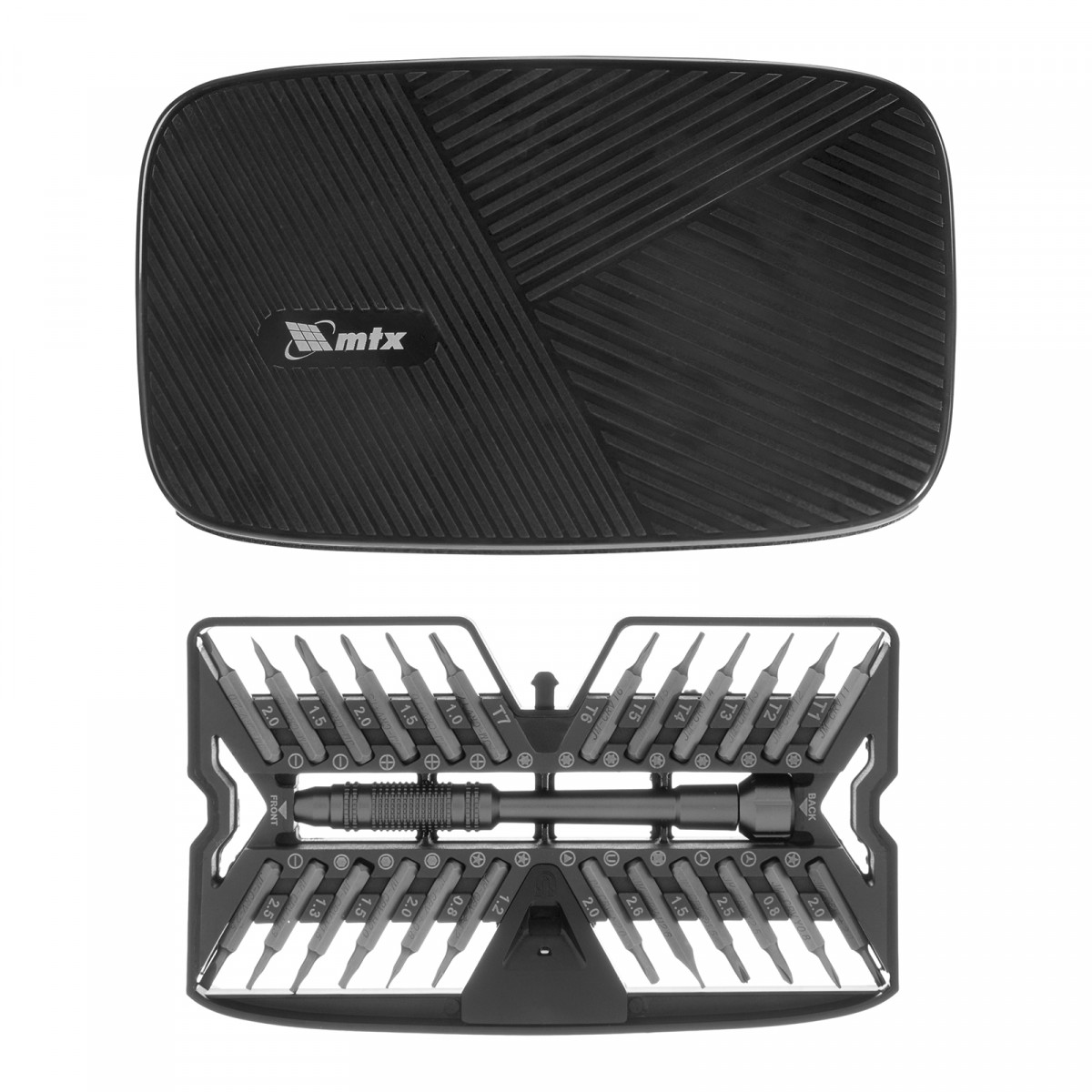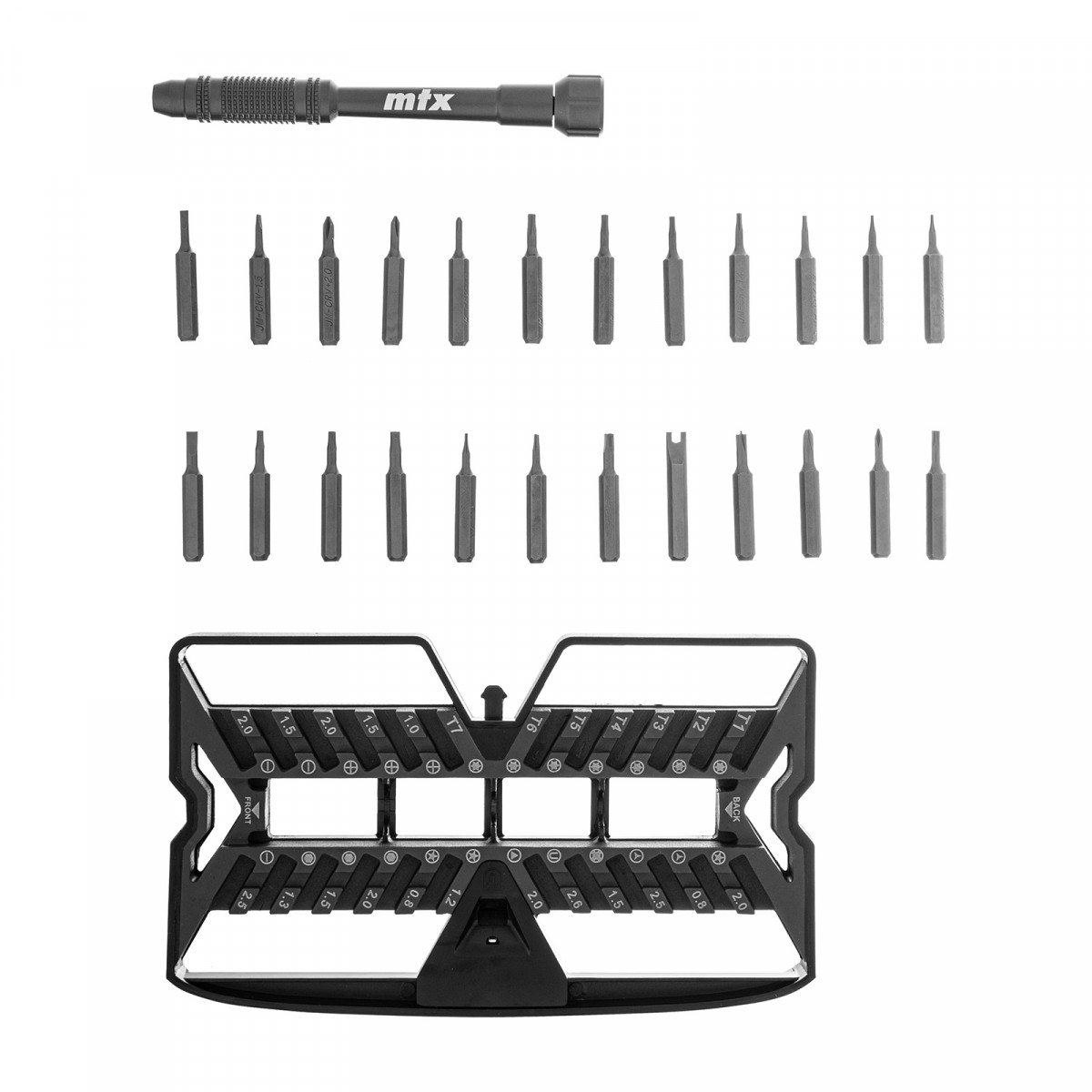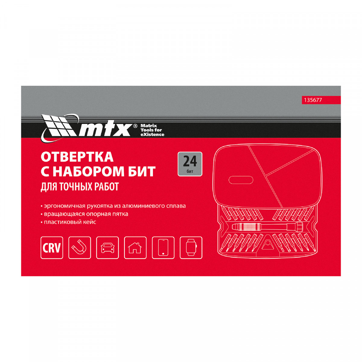 Набор для точных работ 26 в 1 MTX 135677 содержит 24 биты с наконечниками PH, SL,T, H, Str, Y, St, TR, U, отвертку и пластиковый кейс. С его помощью можно отремонтировать очки, игрушки, портативную и бытовую технику и т.д.