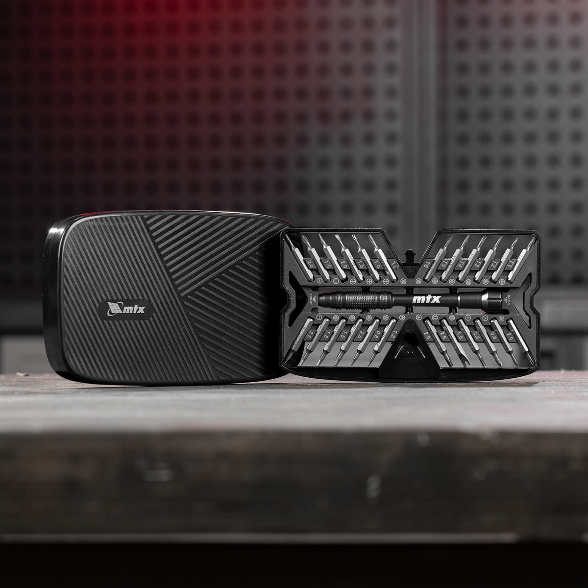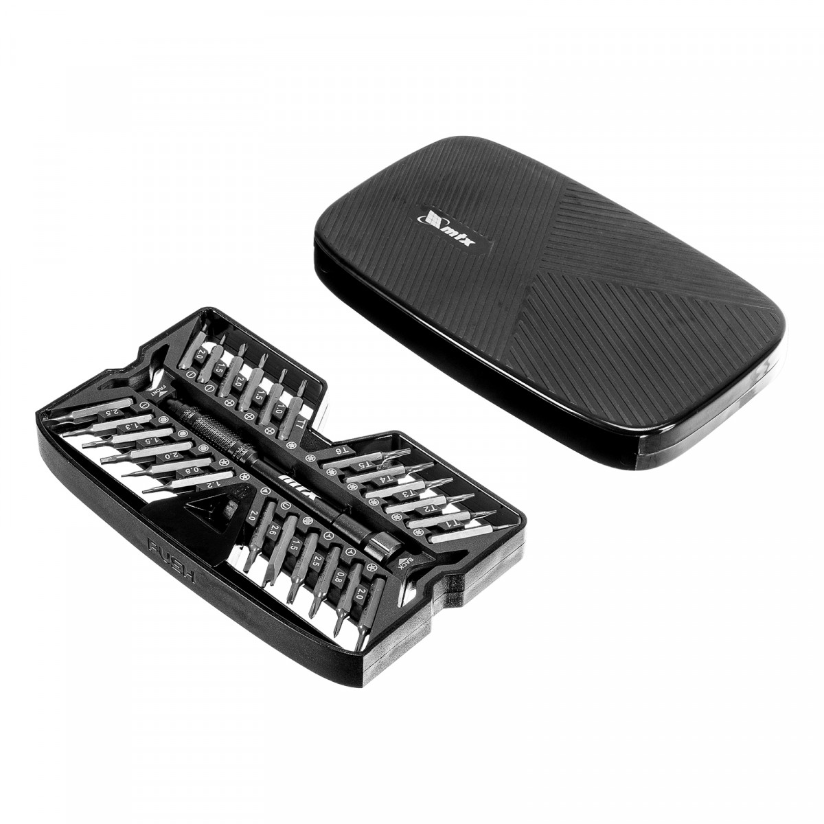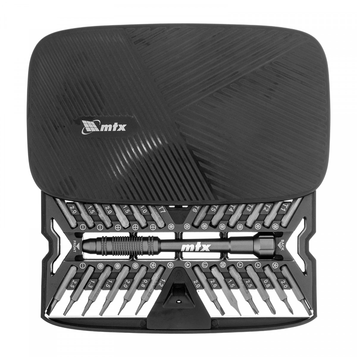 Набор для точных работ 26 в 1 MTX 135677 содержит 24 биты с наконечниками PH, SL,T, H, Str, Y, St, TR, U, отвертку и пластиковый кейс. С его помощью можно отремонтировать очки, игрушки, портативную и бытовую технику и т.д.