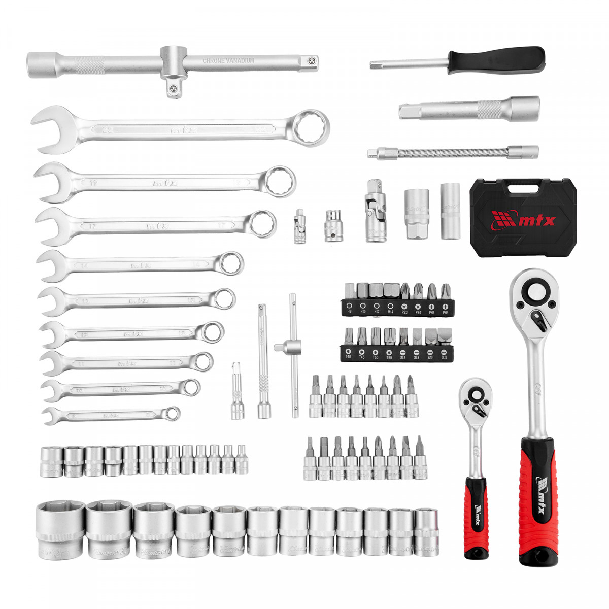 Набор инструментов MTX 13563 упакован в пластиковый кейс и состоит из 82 предметов с присоединительным размером 1/2" и 1/4", предназначенных для слесарных работ, преимущественно монтажа и демонтажа резьбового крепежа с разными типами шлицев. В комплект поставки входят карданы, удлинители и переходники, облегчающие работу в труднодоступных местах. Набор используется для ремонта автомобилей, а также полезен в быту.