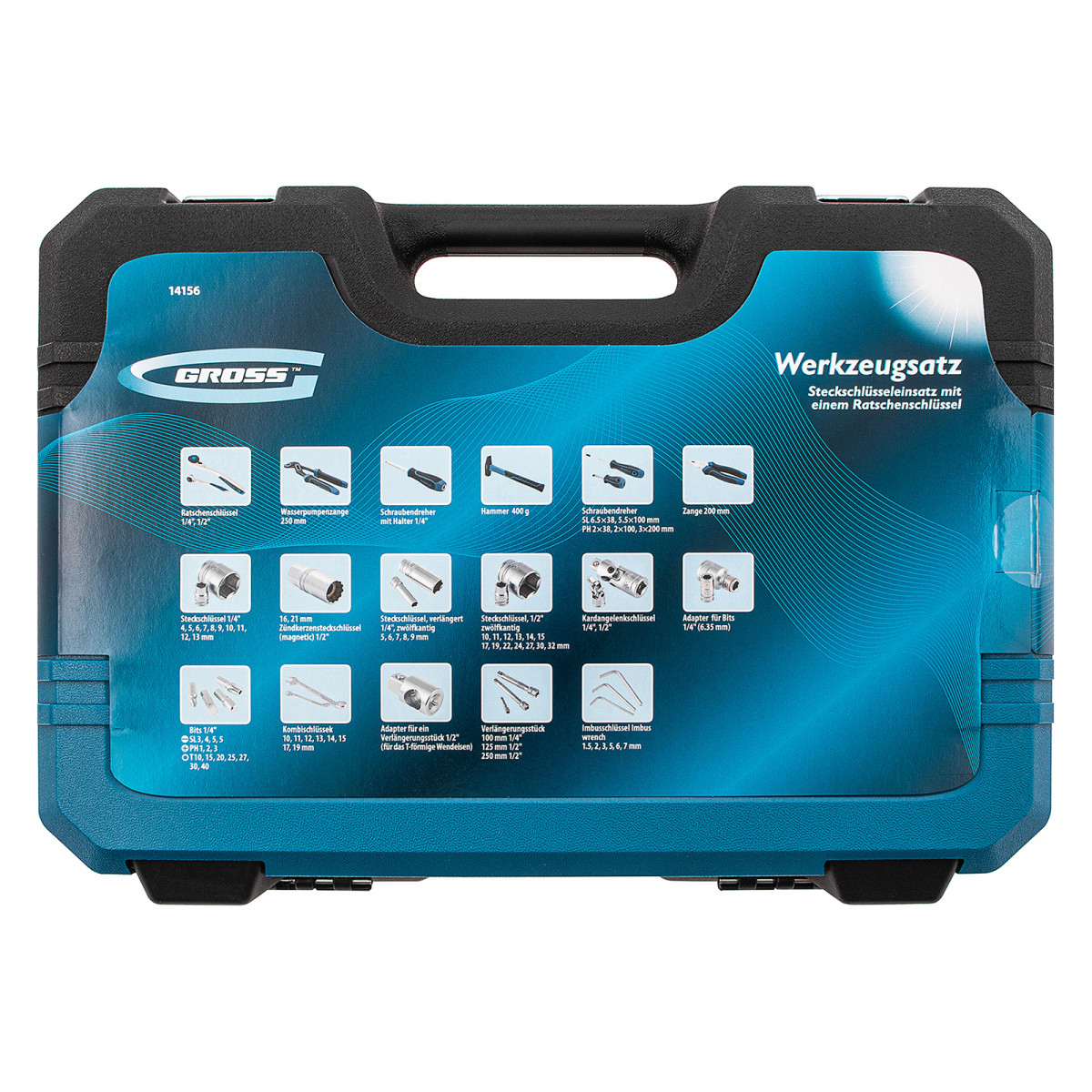 Набор инструментов Gross 14156 включает в себя 76 предметов, в том числе ключи-трещотки со 120 зубьями из стали CrV, с присоединительным размером 1/4" и 1/2". В комплекте инструменты для монтажа и демонтажа резьбовых соединений, молоток для ударных работ, а также переставные клещи и пассатижи, использующиеся для захвата и удержания деталей. Удлинители и карданные шарниры облегчают работу в ограниченном пространстве. Набор пригодится водителям, сотрудникам автосервисов, а также домашним мастерам.