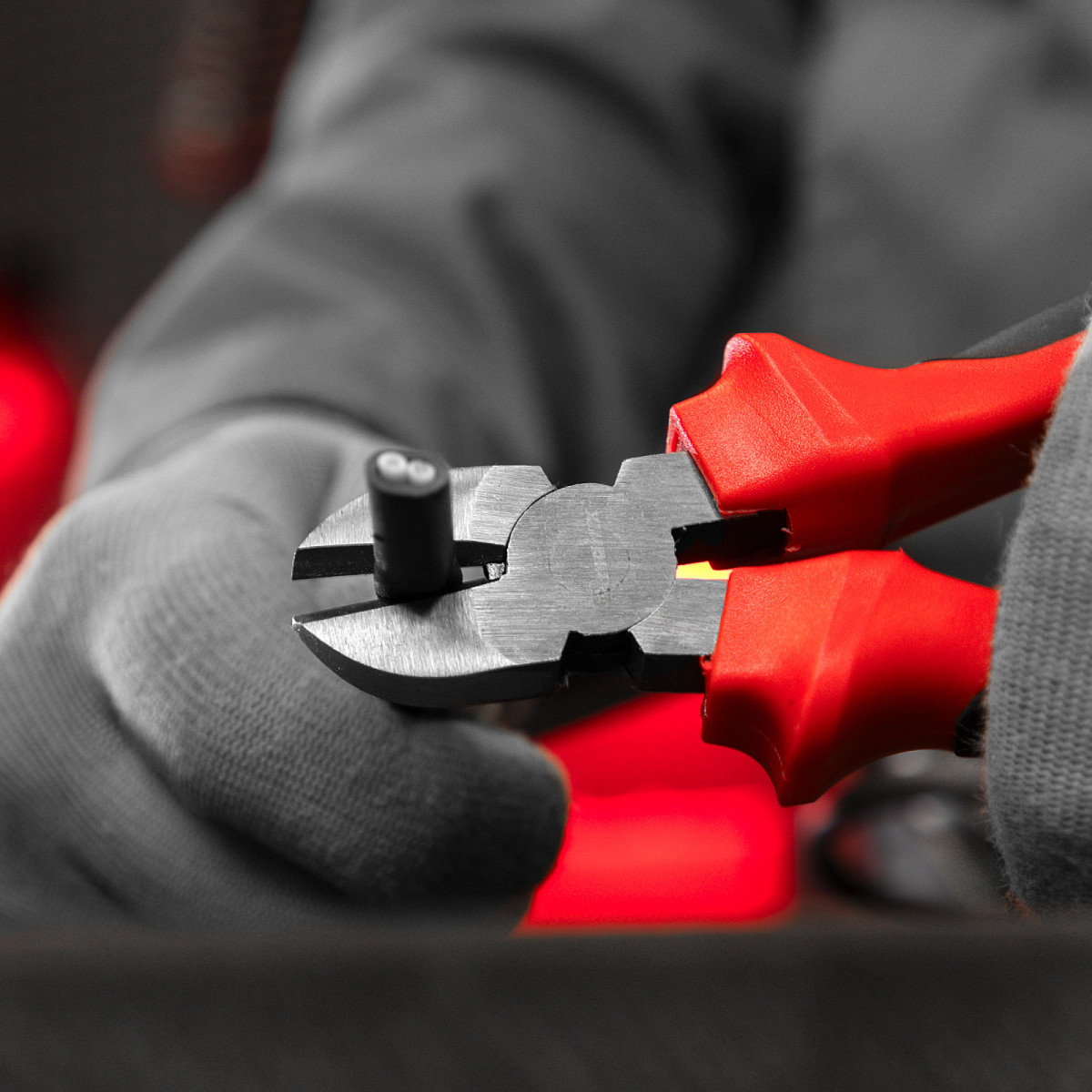 - За счет двухкомпонентных рукояток бокорезы, плоскогубцы и отвертка надежно лежат в руке и не проскальзывают, ограничительные упоры обеспечивают безопасную работу.
