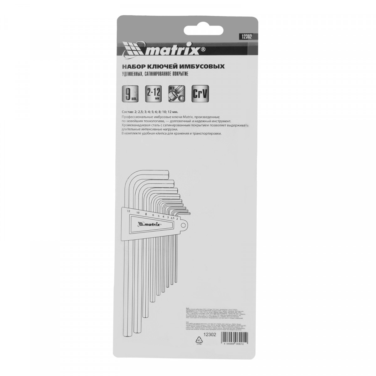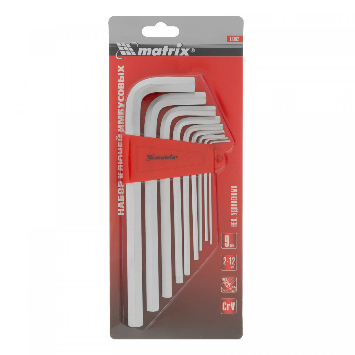 Набор ключей имбусовых HEX, 2-12 мм, CrV, 9 шт, удлиненныее с сатинированным покрытием Matrix