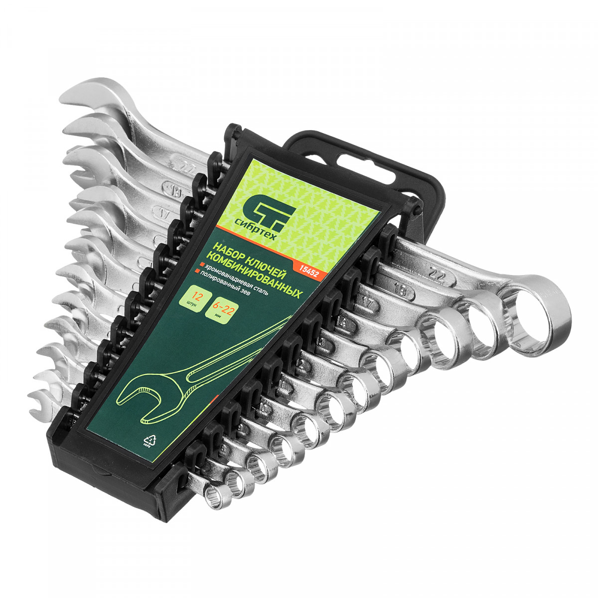 Набор комбинированных ключей Сибртех 15452 включает в себя 12 инструментов из стали CrV для работы с резьбовыми крепежами диаметром от 6 до 22 мм. Каждый ключ снабжен рожковым и 12-гранным кольцевым зевом, который максимально плотно соприкасается с поверхностью гайки или болта — это уменьшает риск ее деформации. Набор незаменим при ремонте автомобиля, а также будет полезен для сборки техники или решения бытовых задач.