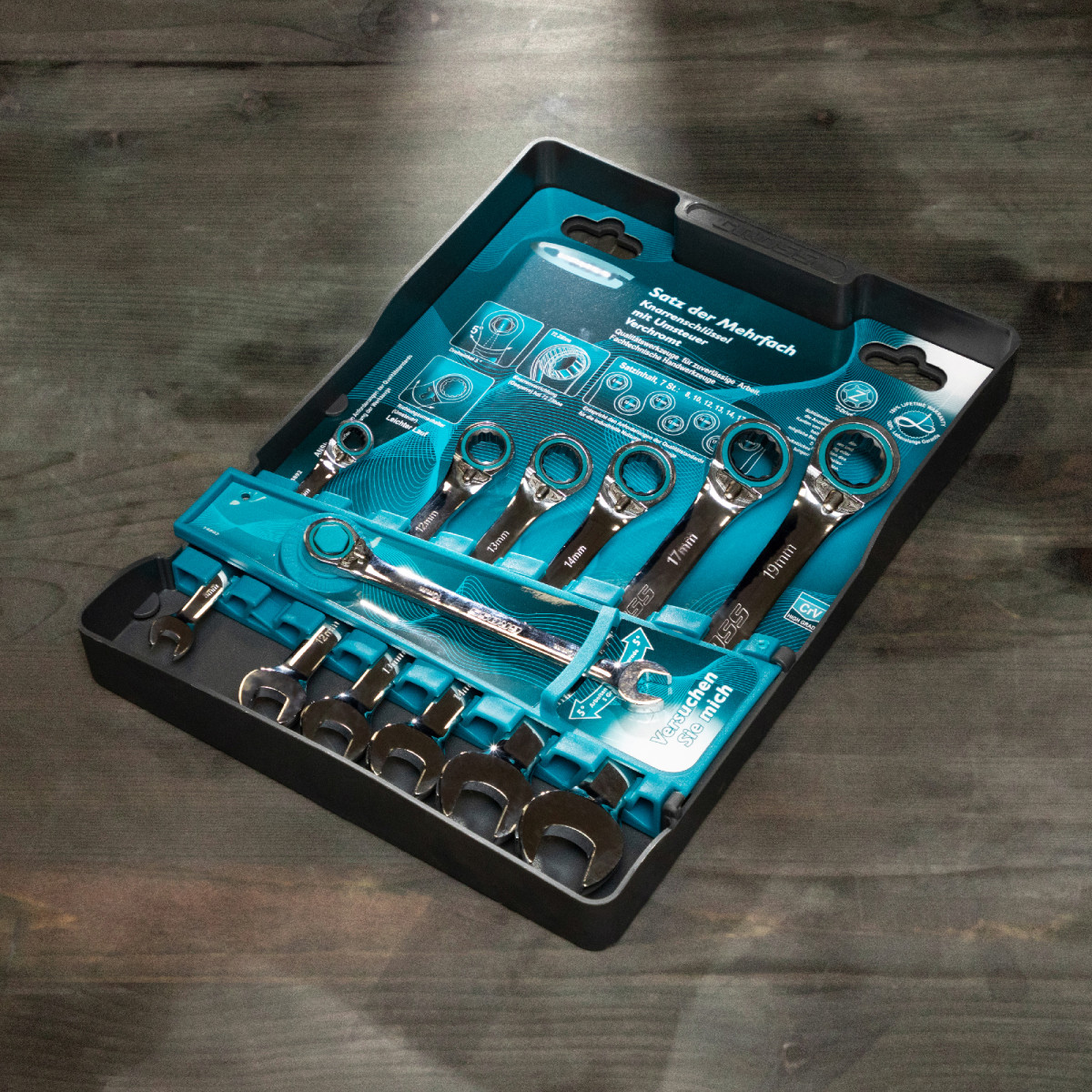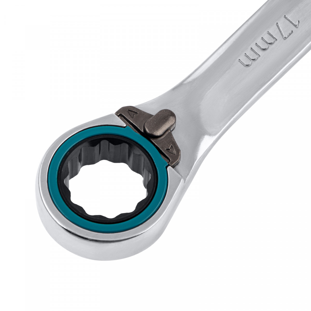 Набор комбинированных реверсивных ключей с трещоткой Gross 14892 используется для монтажа и демонтажа болтов и гаек и включает 7 инструментов размером от 8 до 19 мм, выполненных из стали CrV. Каждый из них имеет две рабочие головки — рожковую и накидную, что расширяет возможности применения. У накидной головки 12-гранный профиль, благодаря чему она надежно захватывает крепеж. Наличие реверса упрощает работу с резьбовыми соединениями. Набор подходит как для профессионального, так и для самостоятельного ремонта автомобилей.