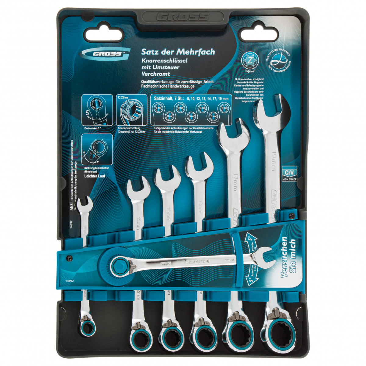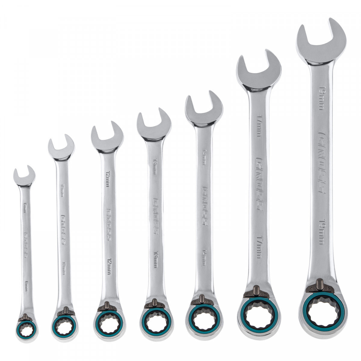 Набор ключей комбинированных с трещоткой, 8-19 мм, 7 шт, реверсивные, CrV Gross