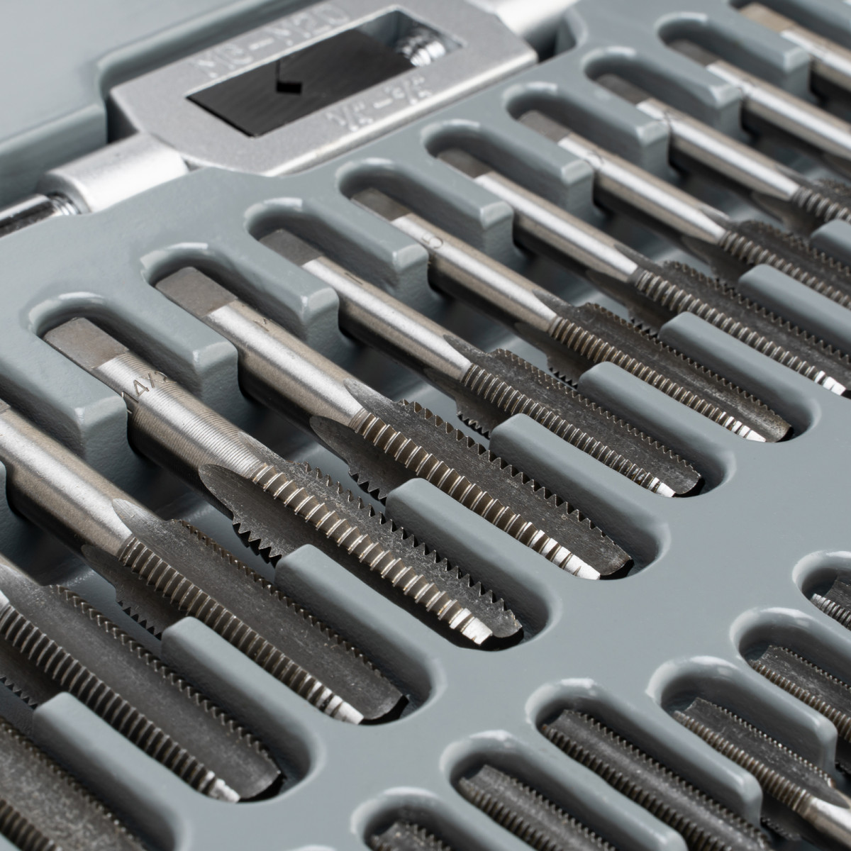 - Быстрый поиск нужного инструмента — на каждый предмет нанесено обозначение размера и шага резьбы.