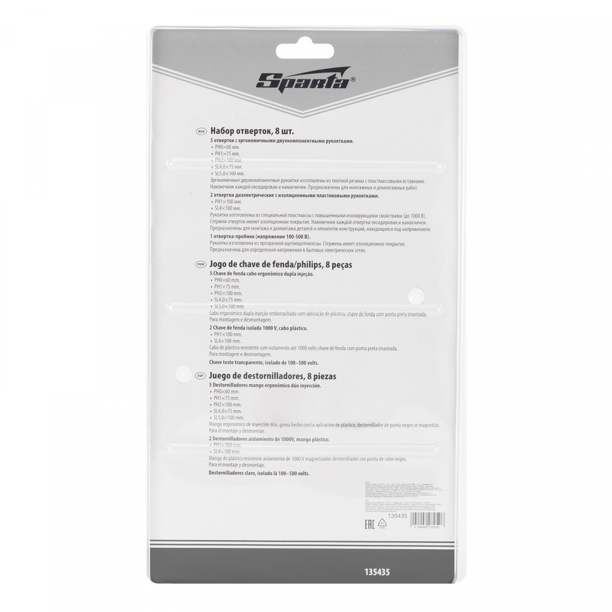 Набор отверток Sparta 135435 включает 8 предметов: 5 отверток для монтажа/демонтажа крепежных элементов с профилем PH и SL, 2 диэлектрические отвертки и электрический пробник на 220 В. Он пригодится для ремонта и обслуживания электрооборудования в быту. Важно — техника безопасности исключает проведение работ под напряжением!