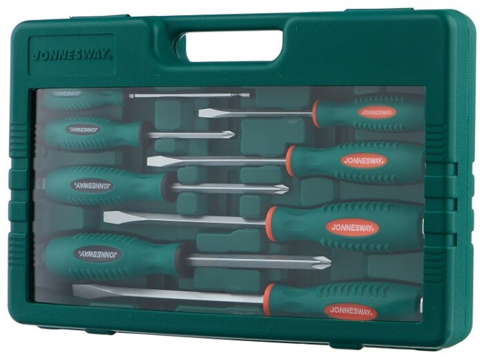 Набор ударных отверток Jonnesway D70PP10S используется для закручивания и выкручивания различных крепежей. Инструмент лежит в кейсе для удобной транспортировки. В наборе есть прямые и крестовые отвертки различного диаметра.
