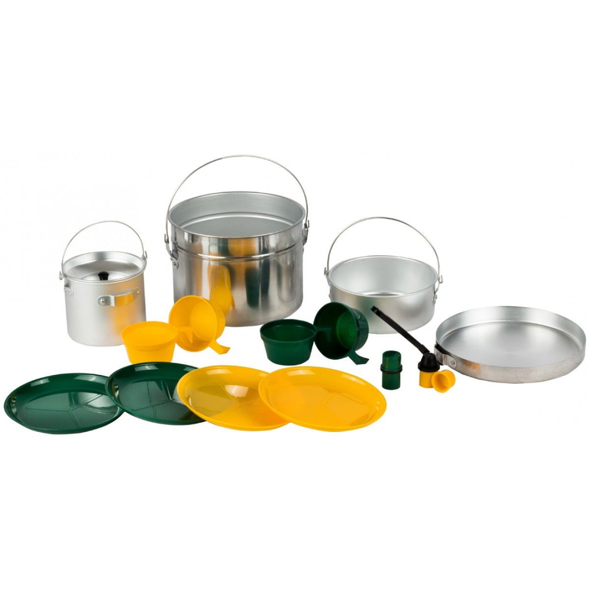 Компактный и удобный набор посуды для приготовления пищи в походных условиях, рассчитанный на 4 человека. Предметы складываются один в другой и имеют небольшой вес, что очень удобно для транспортировки.Набор посуды включает следующие элементы:• котелок (5,45 л) – 1 шт.;