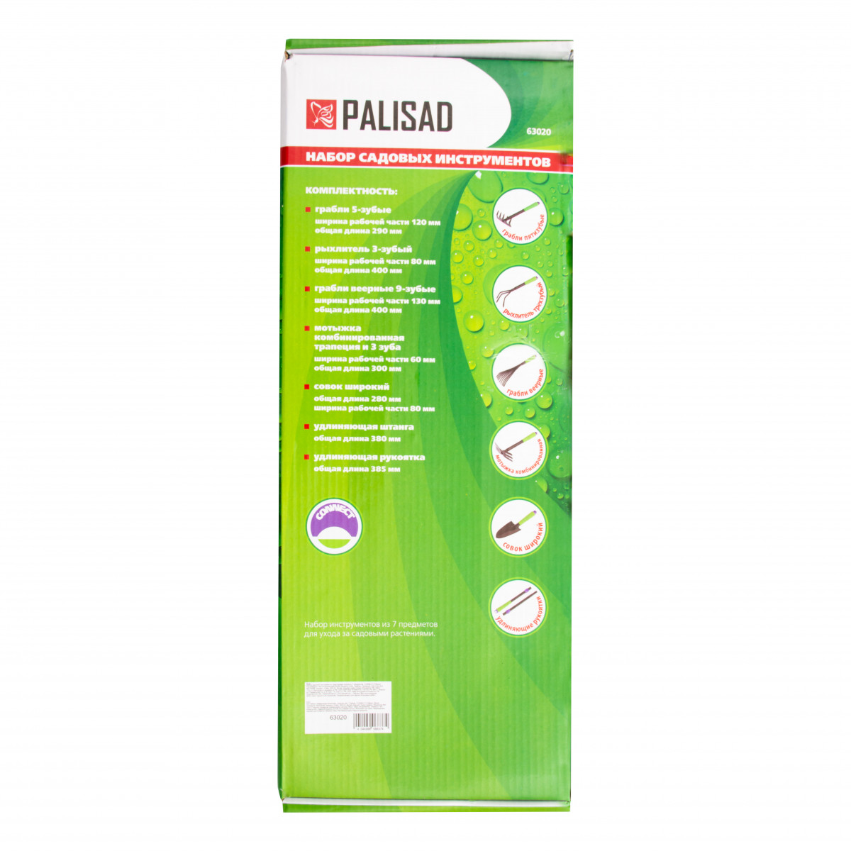 Набор Palisad CONNECT 63020 включает 7 предметов — садовые инструменты с пластиковыми рукоятками для вскапывания, прополки и рыхления почвы, а также сбора листвы и мусора. У каждого инструмента имеется ручка со съемным колпачком, которую можно удлинить при помощи входящих в комплект штанги и рукоятки, подобрав оптимальный для своего роста размер. Набор будет полезен во время работы на дачном участке.