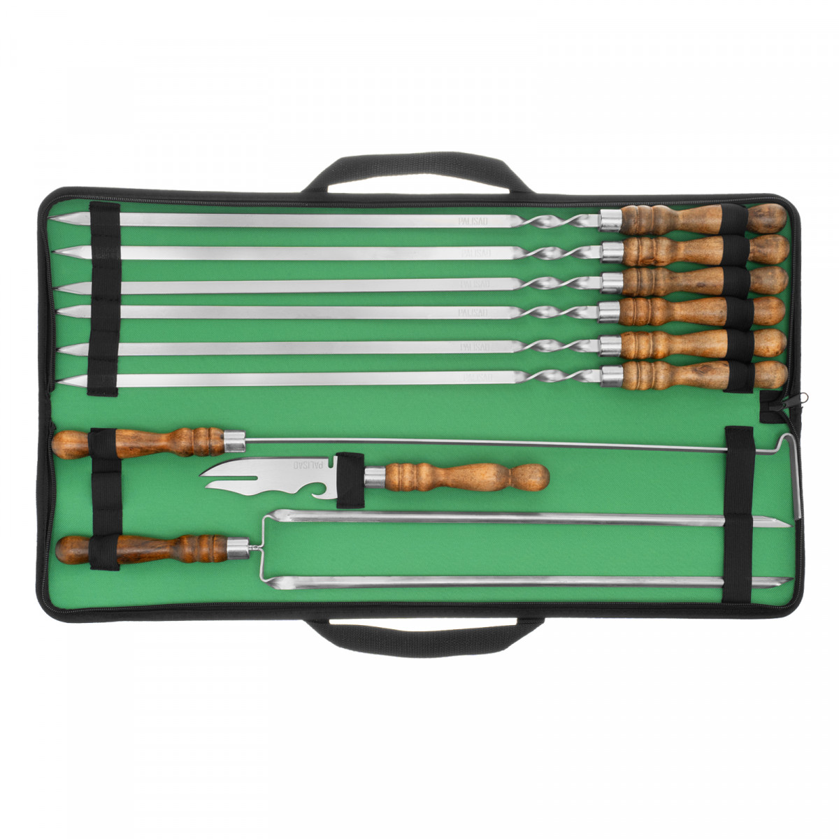 - Прочность и долговечность — элементы набора изготовлены из нержавеющей стали, шампуры увеличенной толщины 2,5 мм не сгибаются и не деформируются под тяжестью продуктов.