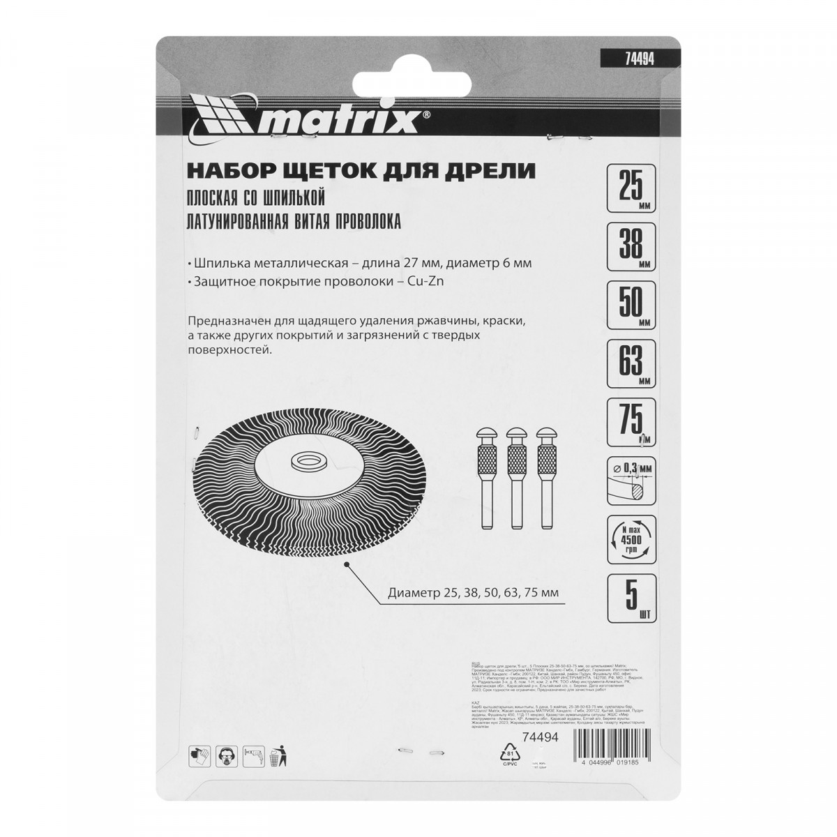 Набор Matrix 74494 состоит из 5 плоских щеток диаметром 25-38-50-63-75 мм со шпильками диаметром 6 мм, предназначенных для установки на дрель с максимальной скоростью вращения шпинделя 4500 об/мин. Насадки позволяют избавиться от тонкого слоя ржавчины, загрязнений и старых лакокрасочных покрытий. Набор рекомендован для обработки углов, пазов, труднодоступных мест.