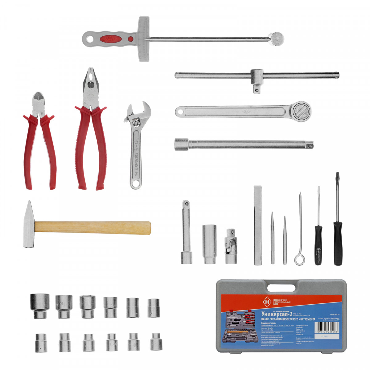 Набор НИЗ «Универсал-2» 13447 в пластиковом боксе включает широкий ассортимент слесарно-шоферских инструментов. С его помощью можно заменить свечи зажигания, осуществить монтаж/демонтаж крепежа, в том числе и в труднодоступных местах, захватить мелкие детали, перекусить проволоку, забить гвозди и т.д.