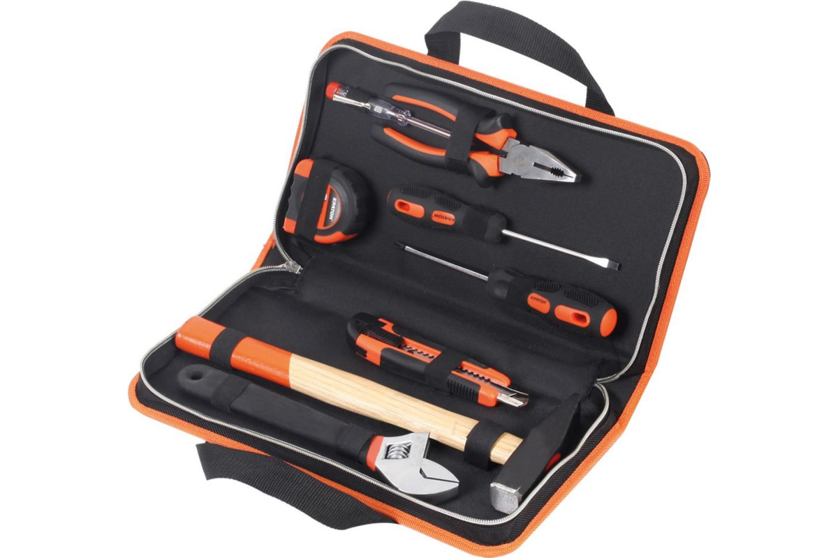 пассатижи, отвертки, ключ, молоток, рулетка, нож, отвертка тестер