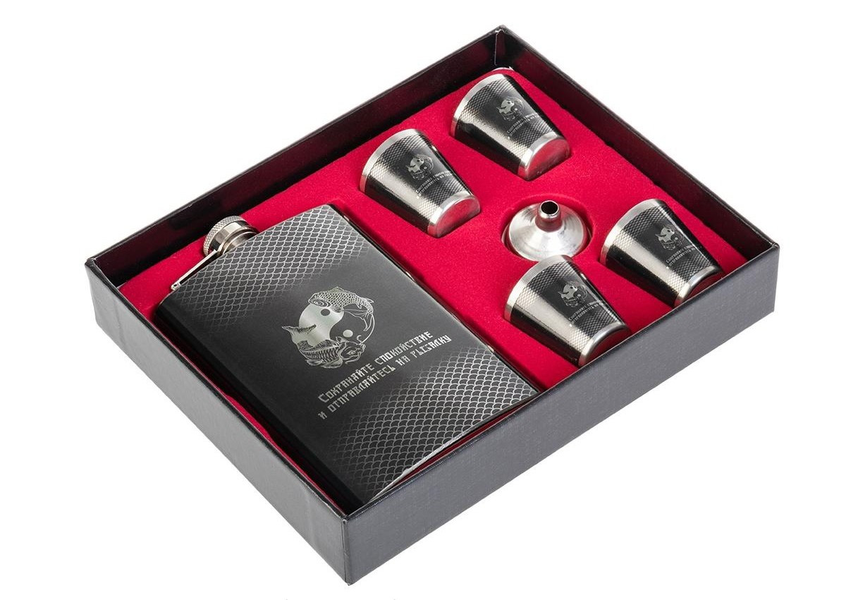 В подарочный набор "Сохраняйте спокойствие " входит: фляжка (270 мл) декорированная матовым напылением, создающая эффект гравировки, 4 стопки и воронка.Материал: нержавеющая сталь