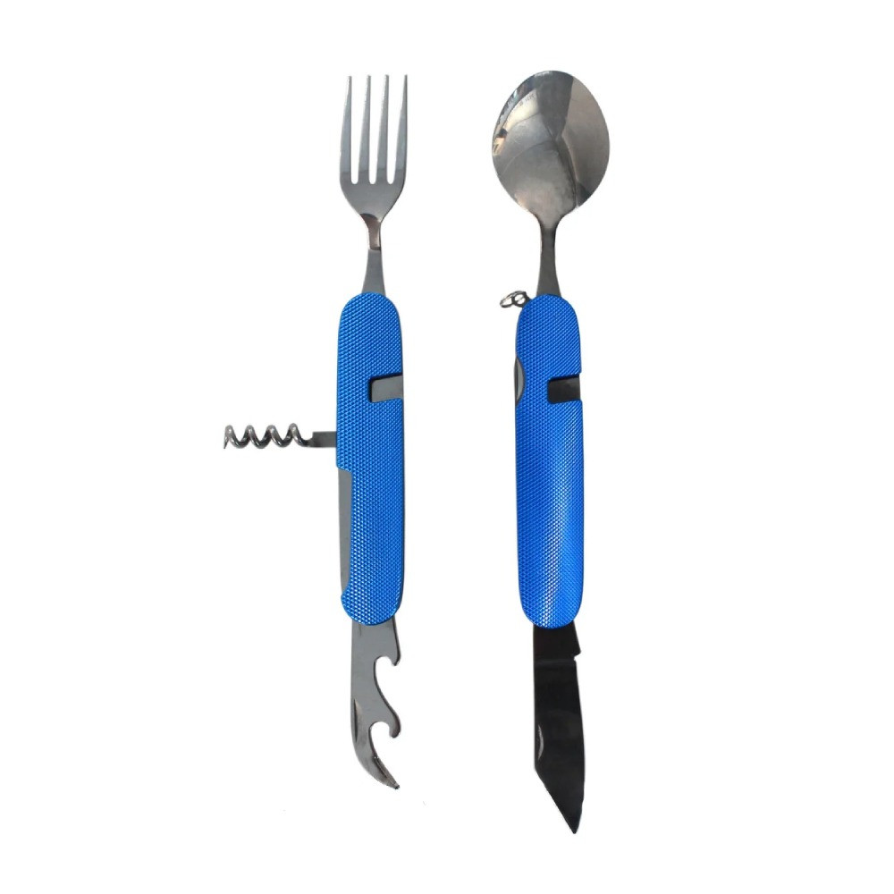 Набор складных столовых приборов мультитул 6 в 1, из качественного металла, внешняя сторона покрыта прочным пластиком.