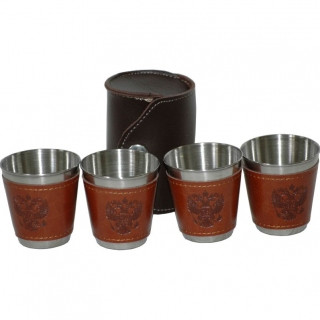 Стопки изготовлены из нержавеющей стали и обрамлены искусственной кожей с тиснением герба России. Стопки хранятся в кожаном кофре.