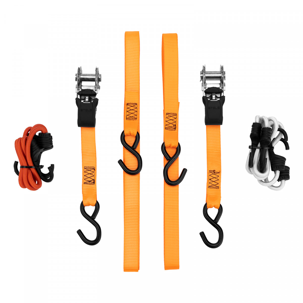 Набор стяжек и резинок Stels 54403 используется для фиксации грузов и будет полезен в автопутешествии. В комплекте ремни с храповыми механизмами, а также резинки разной длины с крюками. Разрывная нагрузка ремней составляет 680 кг, а эластичных стяжек — 50 кг, поэтому они надежно фиксируют предметы различных габаритов, предотвращая их смещение во время перевозки.